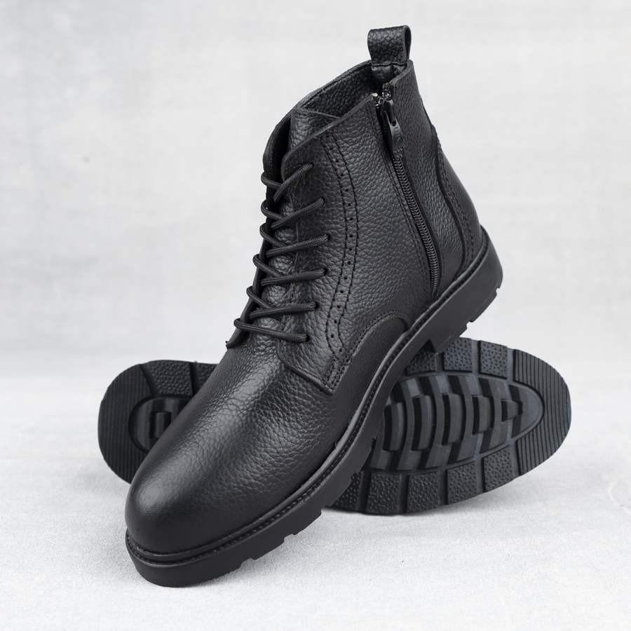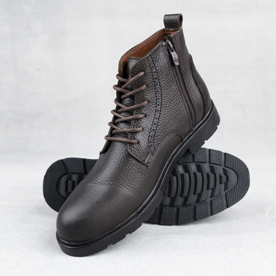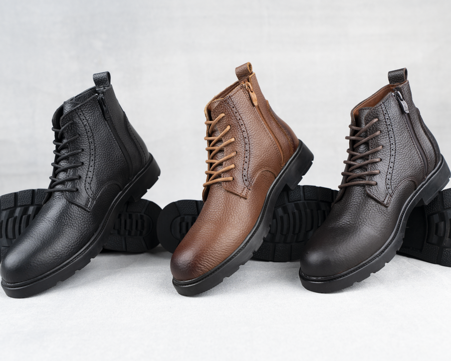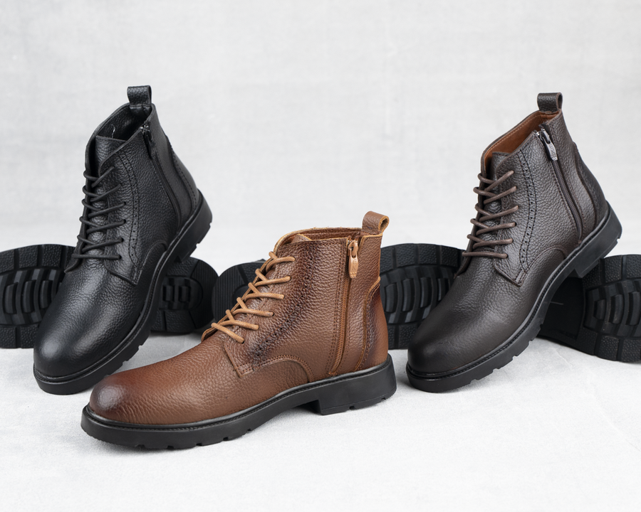 هاف بوت H9 جلد طبيعي 100% بنعل رابر عالي الجودة مع رباط وسوستة جانبية لراحة وأناقة يومية. متوفر بالأسود، البني والهافان مقاسات 41–45.