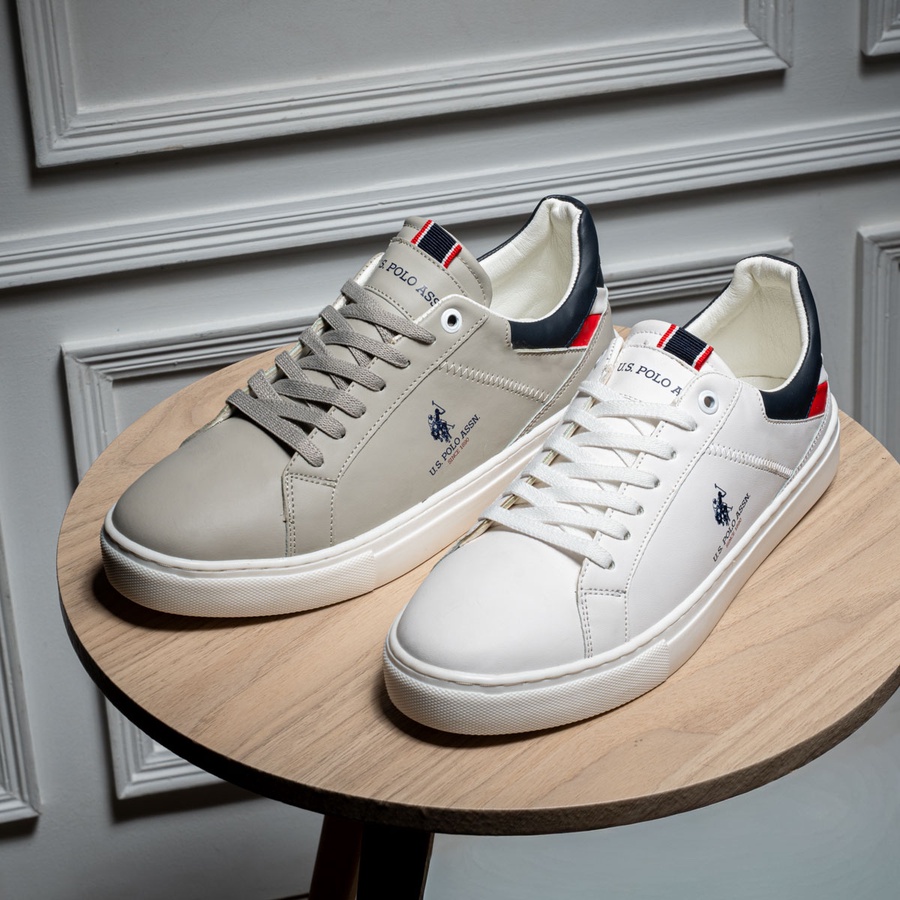 سنيكر Polo V24 بخامة جلد مستورد مع بطانة مرنة وفرش طبي مريح. تصميم Low-Top عملي متوفر باللون الأبيض والرمادي مقاسات 41–45.