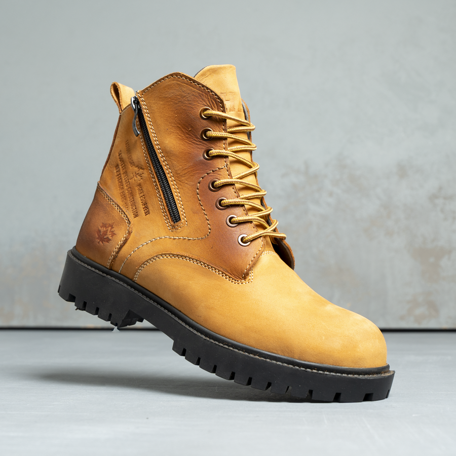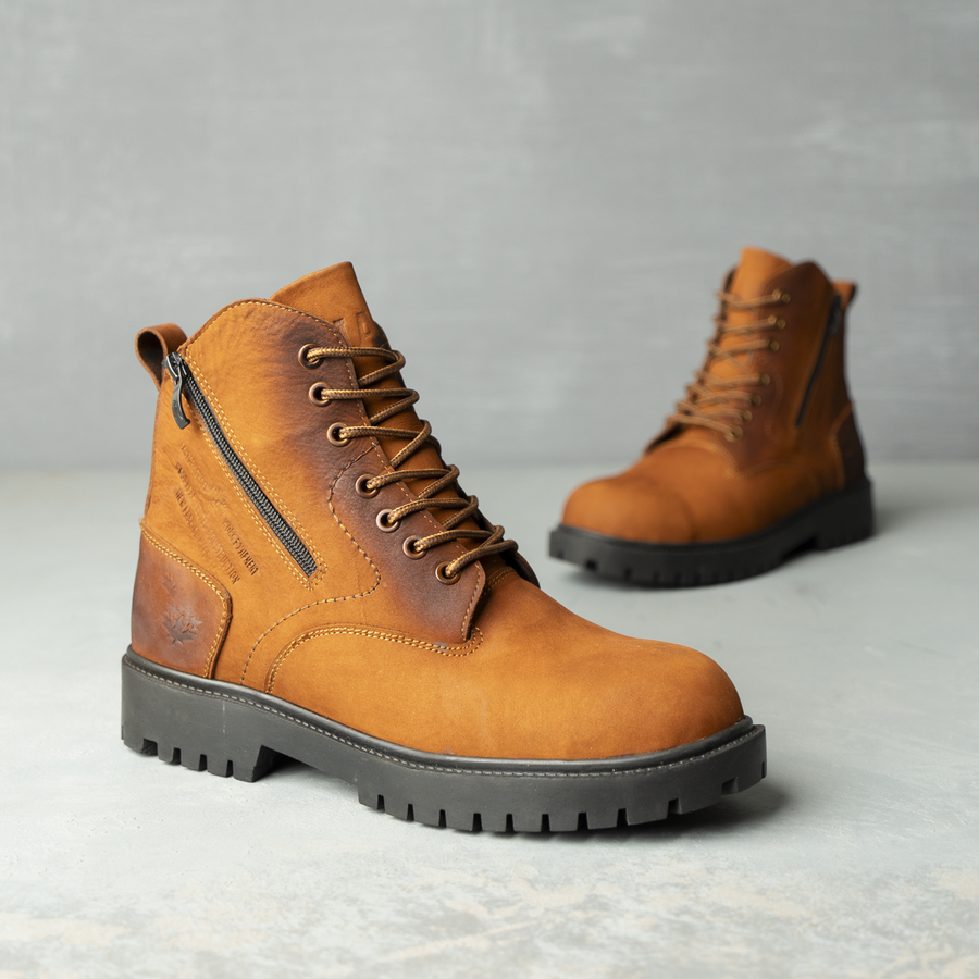 سيفتي شوز بسوستة بمقدمة حديدية مبطنة لحماية القدم مع نعل رابر وفرش مريح. متوفر بالأسود، الصحراوي والهافان مقاسات 41–45.