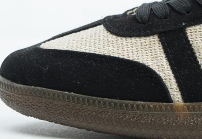حذاء سامبا الرجالي يتميز بخامة خيش مستوردة عالية الجودة، ونعل PVC بيور، وفرش EVA مريح. تصميم أنيق بلون بيج مع خطوط سوداء ونعل بني لإطلالة عصرية مميزة.