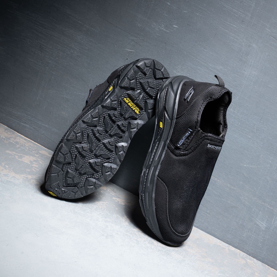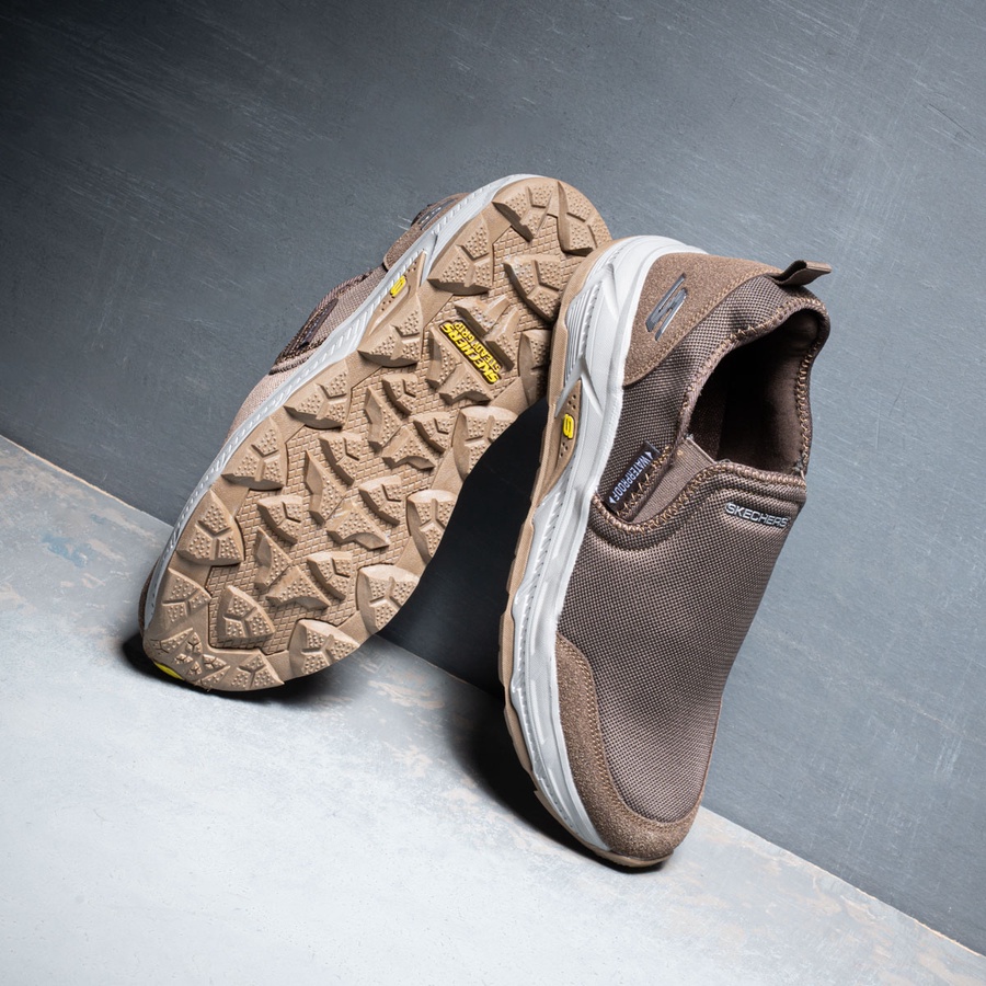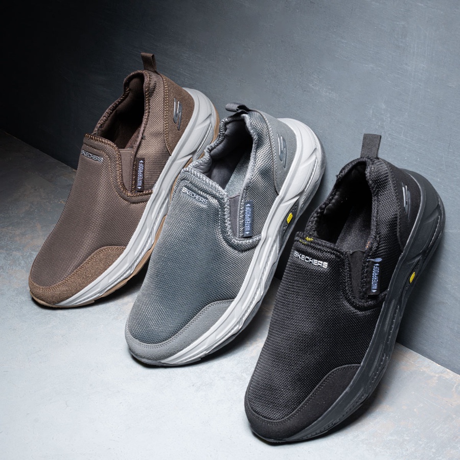 سكيتشر مستورد بنعل EVA مريح وطبقة رابر للحماية، تصميم Slip-on عملي، فرش طبي عالي الجودة، ألوان: أسود، بني، رصاصي.