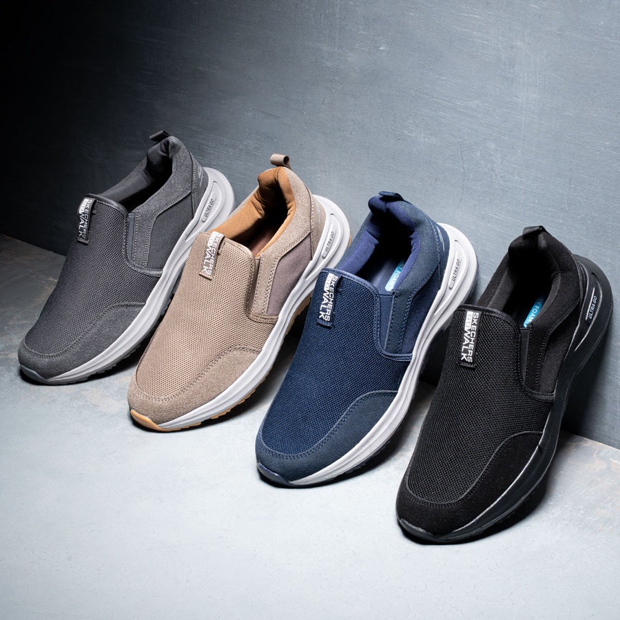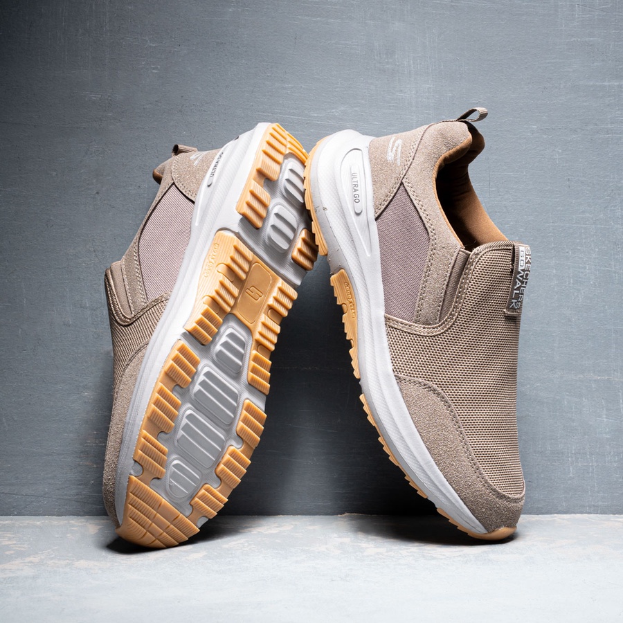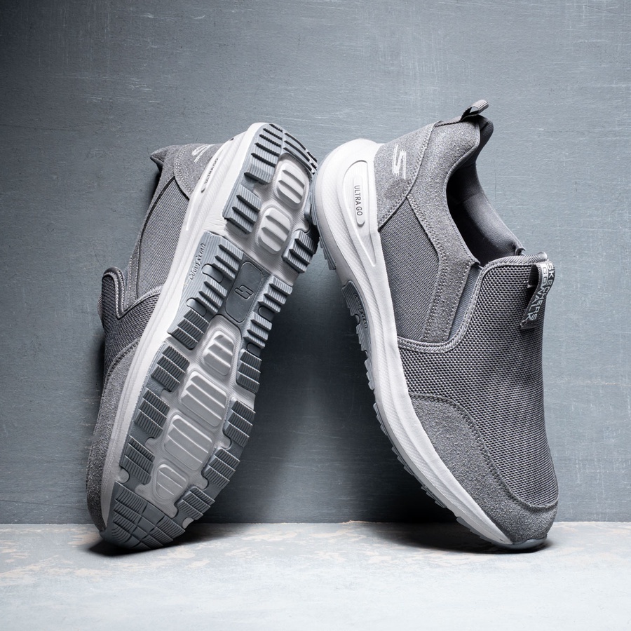 سكيتشر مستورد بنعل ULTRA GO وطبقة Good Year لراحة وامتصاص الصدمات، تصميم بدون أربطة، فرش فوم داخلي، ألوان: أسود، كحلي، رصاصي، كافية.