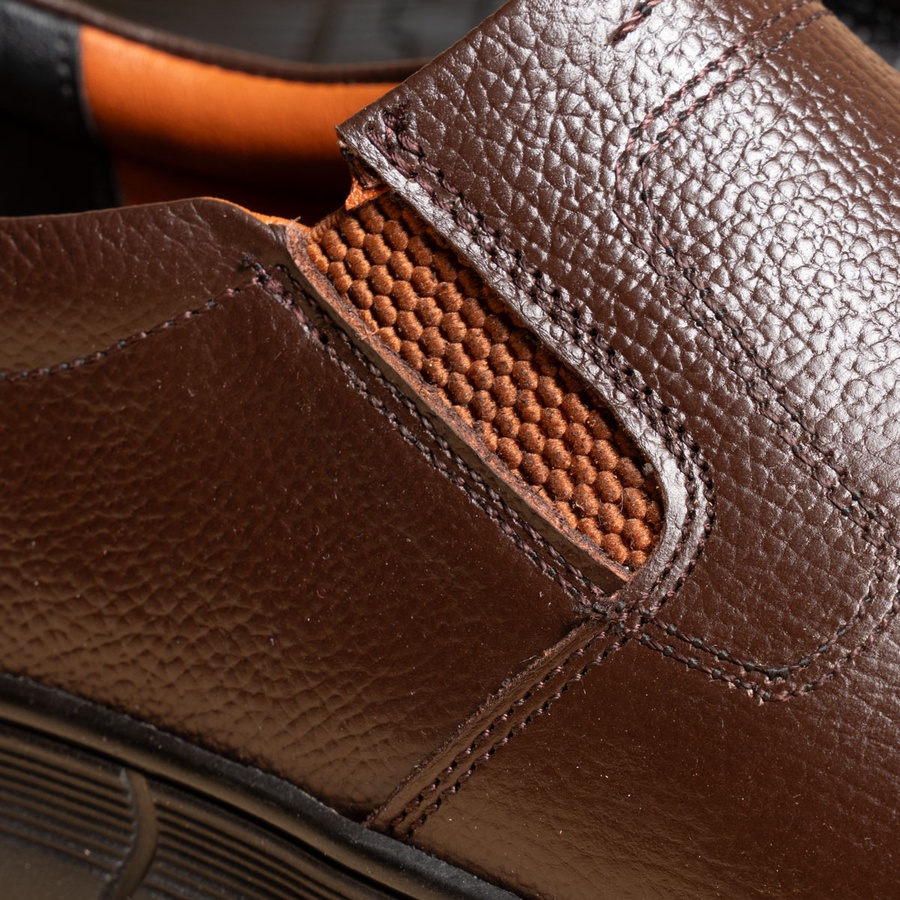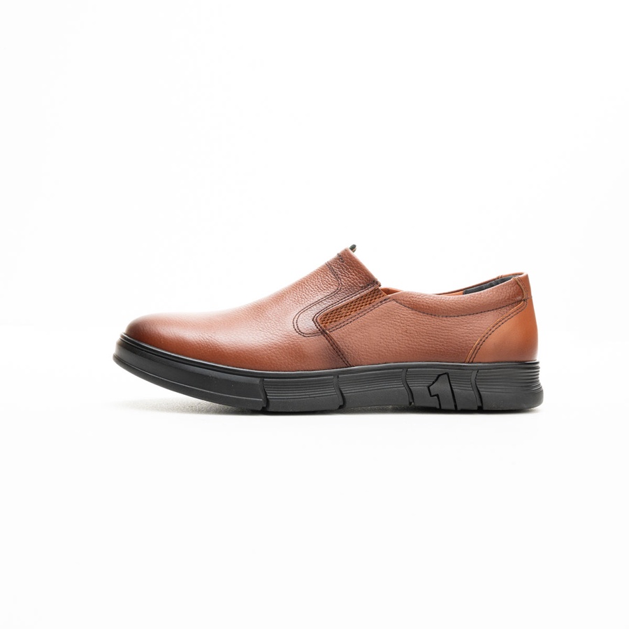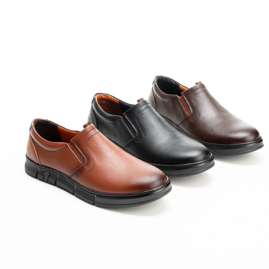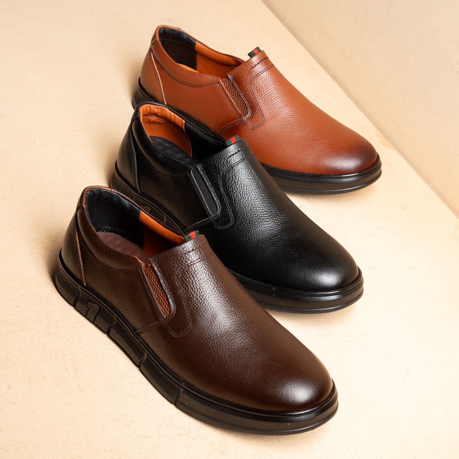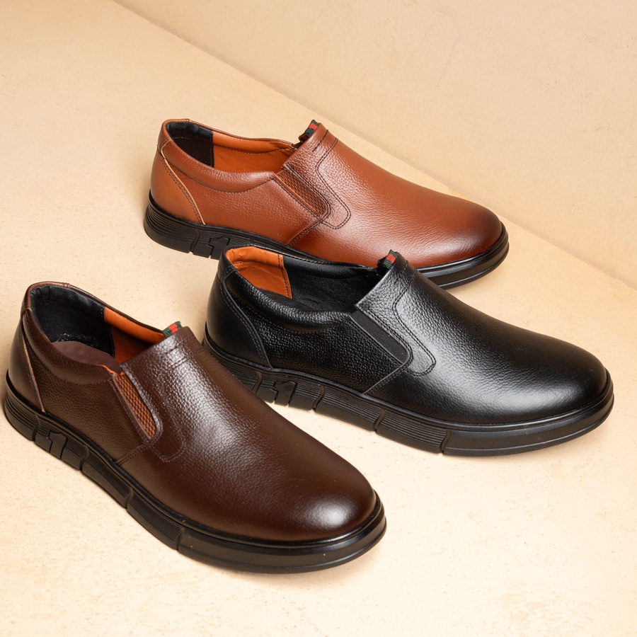 حذاء Slip-on Kan7 جلد طبيعي بدون رباط بنعل رابر خفيف ومريح، مثالي للمناسبات والعمل الرسمي. متوفر بالأسود، البني والهافان مقاسات 41–47.
